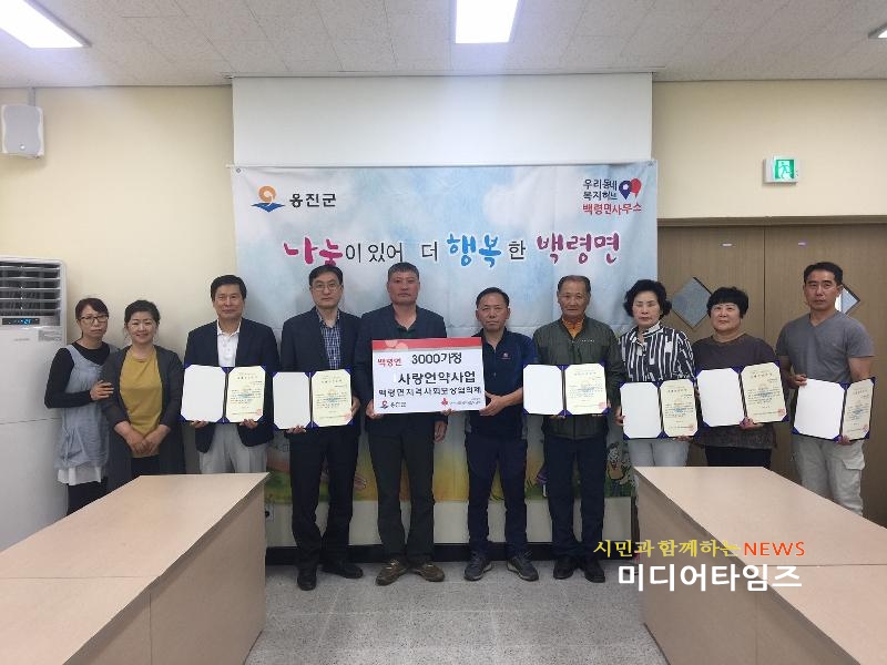 [미디어타임즈=문상수 기자] 인천 옹진군 백령면(면장 이철) 지역사회보장협의체(민간 위원장 심효신)는 지난19일『3000가정 사랑언약사업』자매결연식을 진행했다. 『3000가정 사랑언약사업』은 300만 인천시민과 함께하는 인천공감복지 프로젝트로 저소득 취약계층과 지역주민(기업, 종교단체 등)이 서로 자매결연을 맺어 ‘행복한 인천’을 만들어 나가기 위한 사업이다. 백령면에서는 우선 생계지원이 필요한 저소득 취약 아동·청소년을 대상으로 학교장 및 주민의 추천을 받아 7가정의 수혜자를 선정하였고, 지역사회보장협의체 위원 7명이 1년 동안 매월 후원금(3만원~5만원)을 지원하는 사랑의 언약식 자매결연 증서를 교부하였다. 지역사회보장협의체 박영자 위원은 “소외된 이웃들에게 작은 마음을 전달하여 나눔을 실천 할 수 있어서 뿌듯하다”고 전했다.
