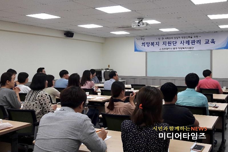 [미디어타임즈=문상수 기자] 인천 동구(구청장 이흥수) 희망복지지원단에서는 지난19일, 구청 평생학습관에서 민·관 사례관리담당자 역량강화를 위한 희망복지지원단 사례관리 교육을 실시했다.이날 교육은 저소득 사례관리대상자를 상담하고 있는 희망복지지원단, 동 주민센터 및 민간 복지기관의 담당자 40여명이 참여한 가운데 실시됐으며, ‘사회복지연구소 마실’강미경 소장이 강사로 나서 ▲강점관점 사례관리의 이해 ▲강점관점 사례관리 실천방법 및 기술 ▲실제 사례를 통한 사례관리 실천방법 탐색 등 사례관리담당자들의 전문 능력 배양을 중점으로 진행됐다. 구 관계자는 “최근 복잡하고 다양한 문제를 내포하고 있는 가정이 많아지고 있는 만큼 사례관리담당자 또한 다양한 분야의 상담능력이 요구되고 있다”며 “사례관리담당자의 역량강화를 통해 주민에게 적절한 복지서비스가 제공될 수 있도록 노력 하겠다”라고 말했다. 한편 동구 희망복지지원단에서는 올해 하반기에‘채무조정 상담기법’및 ‘사례유형별 실천기술’에 대해 교육할 예정이며, 이를 통해 민·관 사례관리 담당자들의 전문 역량을 강화할 계획이다.