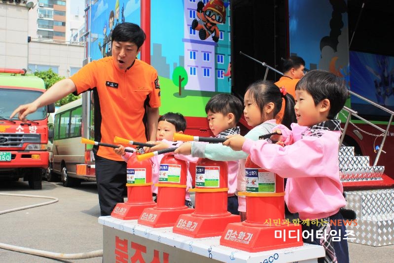 | 소방서에 방문한 유치원생 40명을 대상으로 소방안전교육 모습. <ⓒ미디어타임즈> |
