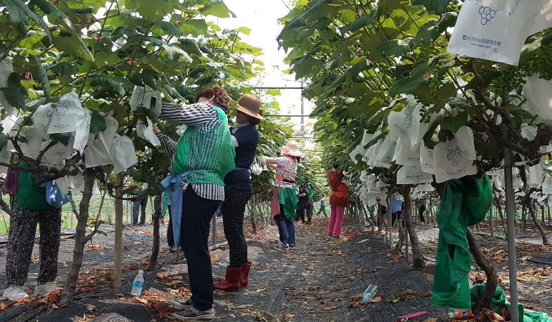 이 날 참여한 지도자들은 “가뭄 등으로 힘든 농촌에 조금이나마 도움을 줄 수 있어 뿌듯하다”며 포도봉지 씌우기 작업에 구슬땀을 흘렸다.