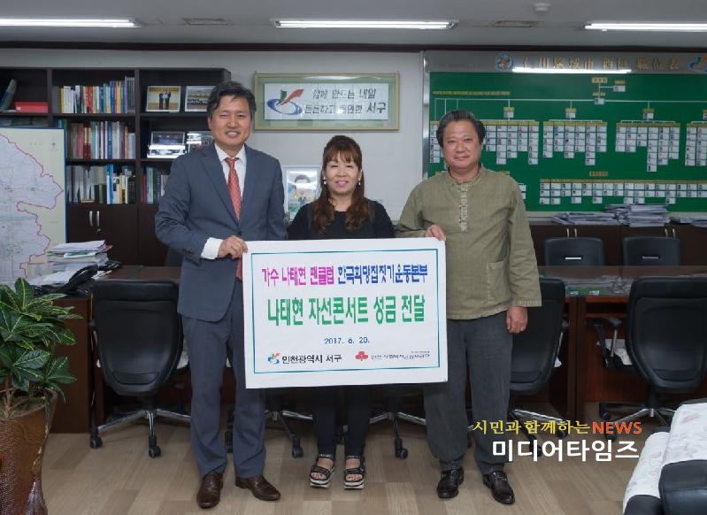 [미디어타임즈=홍기연 기자] ‘사랑을 찾아서’의 가수 나태현과 팬클럽은 지난 20일 자선콘서트로 마련한 성금 100만원을 서구청에 전달했다.