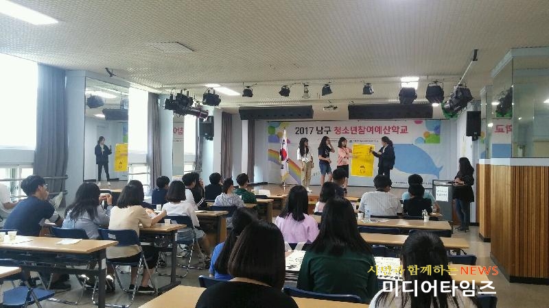 [미디어타임즈=문상수 기자] 인천 남구(구청장 박우섭)는 지난 10일부터 17일까지 3회에 걸쳐 희망 청소년 49명이 참여한 ‘2017년 남구 청소년참여예산학교’를 개최했다.주민참여예산 일환으로 열린 이번 청소년참여예산학교에서 참가자들은 자유로운 토의로 행복한 남구 만들기 아이디어, 정책제안과 투표를 통해 사업 우선순위를 결정했다.최우선순위로 결정된 제안은 학교 근처에 학용품, 우산 등을 대여료를 내고 빌려 쓸 수 있는 ‘청소년 대여 시스템’을 만들자 내용이 차지했다.이날 참가자 중 한 학생은 “우리들의 시각에서 남구를 바라보고 자유롭게 정책을 제안하는 보람된 시간이었다”며 “제안한 사업이 정책에 반영, 추진됐으면 좋겠다”며 소감을 전했다.박우섭 남구청장은 “청소년들이 제안한 정책을 적극적으로 검토, 예산이 반영될 수 있도록 노력하겠다”고 말했다.2018년에 반영될 주민참여예산은 9월중 주민총회를 열어 결정할 예정이다.