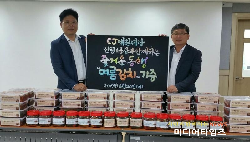 [미디어타임즈=문상수 기자] CJ제일제당(주)인천1공장(공장장 김영창)은 지난 20일 중구자원봉사센터(소장 이주영)에 방문하여 직원들이 정성스럽게 담근 갓김치 3kg, 55개를 소외된 이웃들에게 전달해 달라며 후원물품을 기탁했다. CJ인천1공장은 2014년 주거개선사업 관련 180만원을 기탁을 시작으로 2015년 직접 담근 매실청을 후원하고, 2017년 경로당과 지역아동센터를 방문하여 요리 프로그램을 진행하는 등 다양한 사회공헌활동으로 지역 내에서 귀감이 되고 있다. 중구자원봉사센터 이주영 소장은 “꾸준한 활동이 쉽지 않음에도 지역을 위한 봉사활동에 지속적으로 참여해주셔서 진심으로 감사하다”며 기업의 무궁한 발전을 기원했다. 기탁물품은 중구자원봉사센터 자원봉사상담가들이 복지사각지대에 있는 소외이웃을 발굴·선정하여 55가구에 전달할 계획이다.