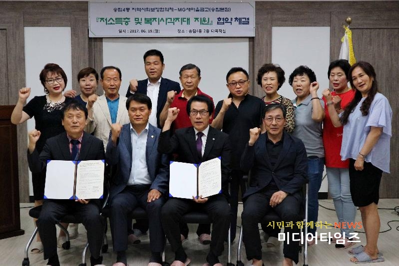 [미디어타임즈=문상수 기자] 인천 동구 송림4동 지역사회보장협의체(공동위원장 노영철, 민간공동위원장 강무회)와 송림새마을금고(이사장 고일상)은 지난19일, 저소득층 및 복지사각지대 지원을 위한 업무협약을 체결했다. 이번 협약에서 양 기관은 관내 저소득층과 복지사각지대 소외계층을 대상으로 우선적으로 필요한 식료품 및 생필품 등을 지원함과 동시에 주거환경이 열악한 경우 소규모 수선 등 주거환경개선을 위해 상호 노력하기로 합의했다.이번 협약으로 관내 저소득 소외계층의 복지수준을 생활밀착형 복지로 한 단계 끌어 올리는 역할을 할 수 있을 것으로 기대하고 있다.노영철 송림4동장은 “우리 지역에 주의 깊게 관심 가지고 보지 않으면 쉽게 지나칠 수 있는 복지사각지대에 놓인 주민들이 많다”며 “이런 위기상황에 놓인 분들이 신속하고 충분한 복지혜택을 받아 위기를 극복할 수 있도록 민․관이 힘을 모아 최선의 노력을 다하겠다.”고 말했다. 고일상 송림새마을금고 이사장은 “이번 협약으로 어려운 이웃에게 따뜻한 관심과 사랑이 전달되길 바라며 앞으로도 지역주민의 복지 체감도를 높이기 위해 노력하겠다.”고 말했다.
