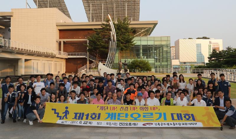 포항시 공무원들이 이색적인 계단오르기 대회를 열어 걷기운동 활성화와 직원화합에 한 몫을 단단히 하고 있다. 포항시청 공무원 노동조합 주관으로 연 '제1회 계단오르기 대회'가 22일 포항시청 건강 오름계단에서 이강덕 포항시장을 비롯해 강호경 전국공무원노동조합 포항시지부장, 조합원, 후원자 등 100여명이참석한 가운데 열렸다 이번 대회는 걷기운동 활성화를 통해 직원 건강뿐만 아니라 직원 화합을 이끌어 내고 하절기 에너지절약에 동참하기 위해 마련됐다. 이날 대회는 남여 청장년부의 개인전과 부서장이 포함된 단체전에 10개 부서가 참여해 총 81명의 포항시청 공무원들이 참여했다. 경기는 포항시청 내에 있는 건강오름계단에서 치러졌으며, 지하1층 계단에서 지정된 시간에 1분 간격으로 출발해 16층에서 참가자별 도착시간을 체크해서 우승자를 가린다. 단체전은 각부의 합산 기록으로 순위를 정한다. 이날 남자 청년부 경기에서는 상수도과 임상운 주무관이 1분 49초, 남자 장년부에서는 농촌지원과 정기석 주무관이 2분 12초, 여자 청년부에서는 일자리경제노동과 김영미주무관이 3분 20초, 여자 장년부에서는 남구청 민원토지정보과 강옥례 주무관이 3분 16초의 기록으로 각각 우승을 차지했으며, 단체전에 투자기업지원과가 13분 4초의 기록으로 정보통신과를 17초 차이로 따돌리고 우승을 차지했다. 개인전과 단체전 우승팀에게는 포항사랑상품권이 주어졌다. 이강덕 포항시장은 “나 자신도 평소 5km 가량 걸어 다니는 걷기매니아”라며, 이번 대회를 통해 우리의 건강을 지키는 걷기운동이 더욱 활성화되길 바란다.“고 말했다. 한편, 포항시는 시청내 건강오름계단 벽면과 바닥에 한개 계단의 칼로리 소모량과 '여기는 건강오름 계단입니다' 란 홍보판을 부착해 찾아오는 방문객과 직원들에게 걷기운동을 권장하고 있다.