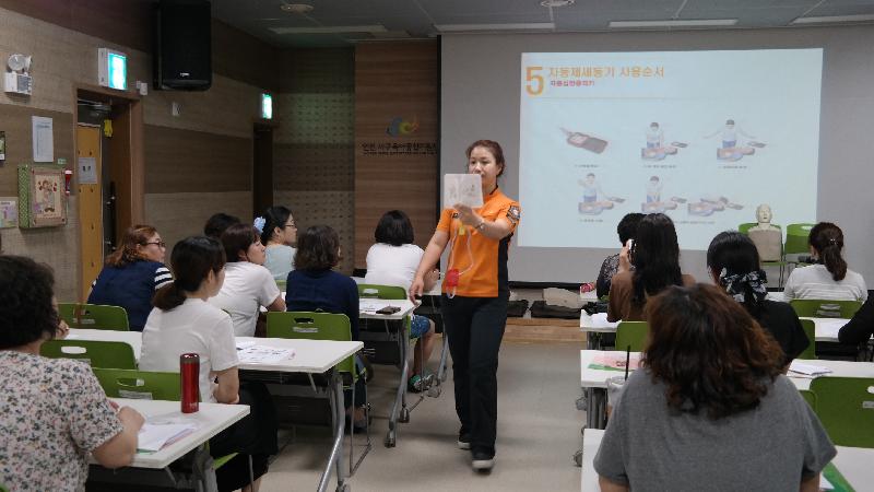 | 인천서부소방서, 육아종합지원센터에서 관내 보육교사 맞춤형 심폐소생술 교육 모습.<ⓒ미디어타임즈> |