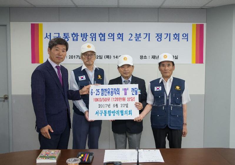 서구통합방위협의회는 지역안보체계를 공고히 하고자 민ㆍ관ㆍ군으로 구성된 단체로서 매년 어려운 이웃을 위해 자발적으로 참여하여 우리 사회에 기부문화를 확산시키는데 노력해 오고 있는 단체로 올해는 6월 보훈의 달을 기념해 대한민국 6ㆍ25참전유공자회 서구지회에 쌀을 지원하게 됐다.