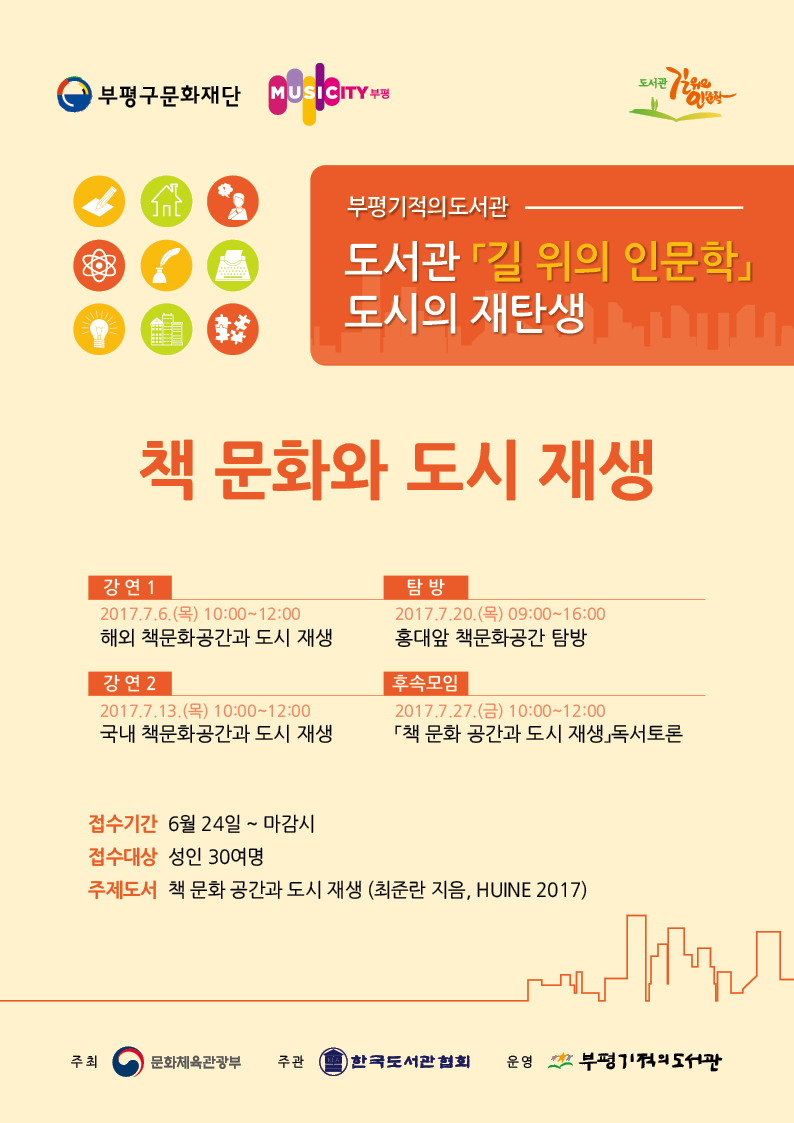 [미디어타임즈=문상수 기자] (재)인천시부평구문화재단(대표이사 박옥진)은 부평기적의도서관에서 다음달 6일부터 11월 3일까지 ‘도시의 재탄생’을 주제로 ‘2017년 길 위의 인문학’ 사업을 운영한다.‘길 위의 인문학’은 문화체육관광부가 주최하고, 한국도서관협회가 주관하는 공모 사업으로, 부평기적의도서관은 2015년부터 3년째 공모사업 대상 도서관으로 선정돼 프로그램을 진행하고 있다.올해는 사회적 이슈인 ‘도시재생’이 가지는 문화적, 인문학적 의미를 알아보기 위해 3차시에 걸쳐 전문가 강연, 현장탐방, 후속모임을 벌일 예정이다.7월 6일부터 27일까지 1차시 주제인 ‘책 문화와 도시재생’과 관련, 일본 다케오시립도서관 등 국내외 책 문화 공간 조성 사례를 살펴보게 된다. 또한 독립서점 거리로 잘 알려진 홍대 일원을 현장탐방한 뒤, 참여자간 독서토론 등의 후속모임을 진행 할 예정이다.부평구의 성인이면 누구나 참여할 수 있다. 참여를 원하는 사람은 오는 7월 2일(일)까지 부평기적의도서관 1층 데스크에서 선착순으로 접수하면 된다.(참가비 무료) 자세한 사항은 부평기적의도서관 누리집(www.bppl.or.kr)에서 확인할 수 있다.