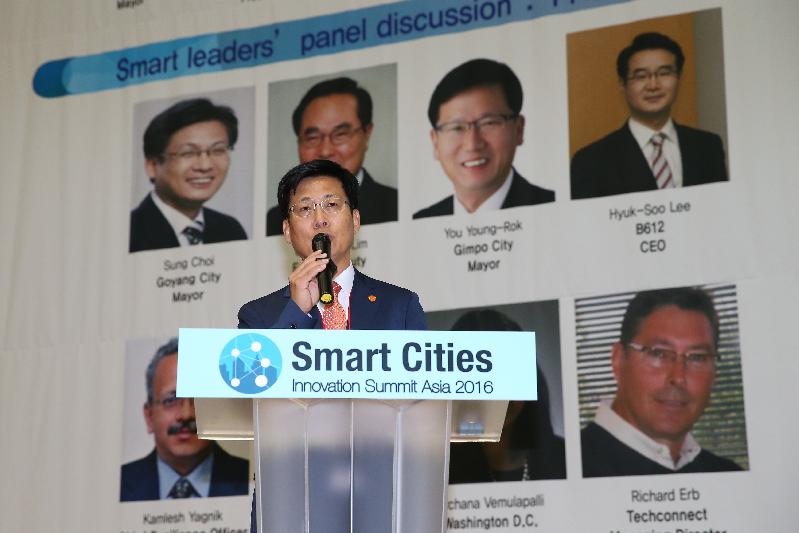 | 2016 스마트시티 이노베이션 서밋 아시아’에서 스마트시티 주제발표 중인 최성시장(2016. 9.) |
