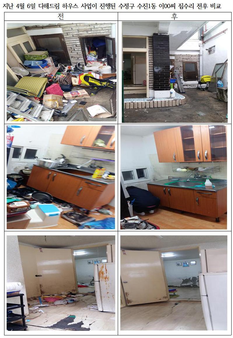 | 지난 4월 6일 다해드림 하우스 사업이 진행된 수정구 수진1동 이00씨 집수리 전후 비교 사진. |