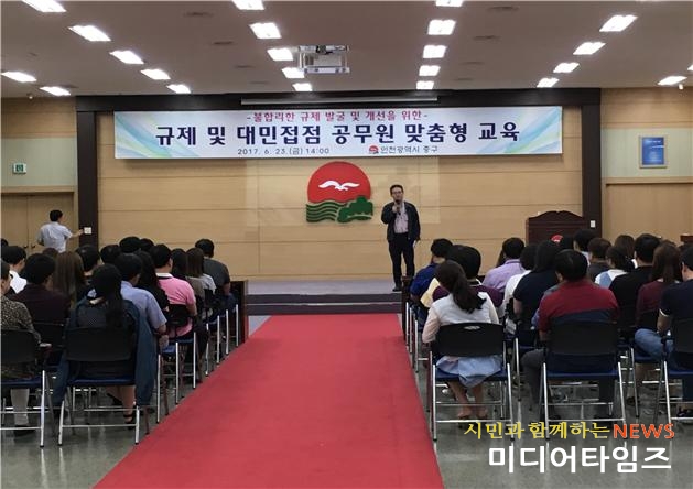 [미디어타임즈=문상수 기자] 인천 중구는 지난 23일 중구청 월디관 대회의실에서 공무원과 시설관리공단 직원 100여명을 대상으로 ‘2017년 규제 및 대민접점 공무원 맞춤형 교육’을 실시했다.이번 교육은 국무조정실 민관합동규제개선추진단 황동언 팀장의 강의로 진행되었으며, 황동언 팀장은 ‘규제개혁 성과 및 공무원의 역할’이란 주제로 규제개혁의 정의 및 타당성과 사례, 그에 따른 공무원의 역할을 소개하고, 새정부 출범 이후 새로운 규제개혁 성과 지표로 도입된 네거티브 규제에 대해 설명하였다. 구 관게자는 “자유공원일대 고도제한 완화 및 문화재주변 보존지역 범위 완화, 내항재개발 등 중구의 규제개혁 필요성이 지속적으로 제기되는 가운데, 중구 직원들은 이번 교육을 통해 규제개혁에 대한 지속적인 관심을 가지고, 불합리한 규제에 대한 구민의 목소리에 귀 기울이는 등 규제개혁을 추진할 계획”이라고 밝혔다.
