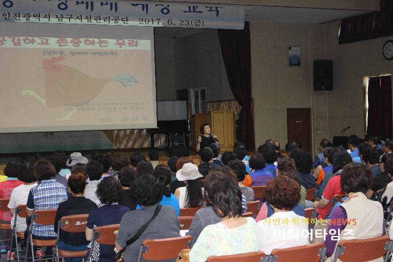 [미디어타임즈=문상수 기자] 인천 남구시설관리공단은 지난 23일 구청 대회의실에서 ‘성희롱·성매매 예방교육’을 실시했다.강의는 인천여성복지연합회 회장과 인천 폭력예방교육전문기관 ‘하모니’ 대표를 맡고 있는 김신숙 전문강사가 진행했다.김 강사는 성희롱·성매매 교육의 배경과 필요성, 그 폐해와 심각성, 지도자로서 폭력예방을 위한 노력, 아동·청소년폭력에 대한 적극적인 역할 등 사례를 통해 교육했다. 남구시설관리공단 관계자는 “이번 교육이 남구시설관리공단 임·직원 모두가 건전한 가치관을 수립하는데 많은 도움이 됐을 것으로 기대된다”며 “사회적으로 물의가 되고 있는 가정·아동폭력 등의 피해가 발생할 경우 관련기관에 신고하는 등 선도적 역할을 수행하겠다”고 말했다.