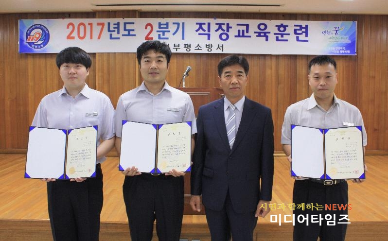 [미디어타임즈=문상수 기자] 인천부평소방서(서장 노경환)는 26일 소방서 3층 강당에서 소방행정 발전에 유공이 있는 소방공무원 3명에 대한 표창을 실시했다. ‘소방행정 유공’은 시민의 생명과 재산을 보호하기 위한 정책인 소방행정 분야 각 부문에서 역량을 발휘하거나 현장 활동으로 시민의 생명과 재산 보호에 기여한 소방공무원을 선발·표창하는 자리로 구조대 심준규, 구급대 김정훈, 갈산119안전센터 임명수 대원에게 소방서장상을 수여했다. 노경환 부평소방서장은 “질 높은 소방행정과 신속한 현장대응으로 부평의 자랑이 된 수상자 모두에게 축하의 인사를 전한다”며 “시민을 위해 봉사하는 소방공무원의 모습으로 거듭 나길 바란다”고 전했다.