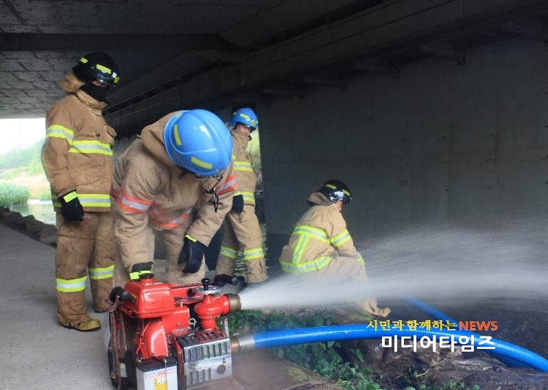 [미디어타임즈=문상수 기자] 인천부평소방서(서장 노경환)는 지난 26일 굴포천 및 굴포누리기후변화체험관 일대에서 풍수해 현장대응 능력을 높이기 위한 긴급구조통제단 불시 가동훈련을 실시했다.긴급구조통제단 불시 가동훈련은 각종 재난이 발생하는 경우 현장지휘체계를 확립하고 대응활동을 신속하고 효율적으로 수행하고자 재난의 규모 및 종류에 따라 긴급구조통제단을 가동하는 훈련이며 실제 현장감 있는 훈련을 위해 불시에 실시한다. 이번 훈련은 태풍의 북상으로 부평구 전역에 강풍 및 호우경보가 발령되고 폭우로 굴포천이 범람해 굴포누리기후체험관에 있던 시민들이 고립되어 인명구조 및 침수 복구가 요구되는 상황을 부여하였다. 다수의 요구조자 발생 상황에 따라 상황 전파를 시작으로 소방대의 인명구조 활동에 이어 대응 1단계를 발령해 긴급구조통제단 활동과 구청, 경찰, 한전 등 8개 기관 및 단체와 인원 98명, 차량 18대가 동원되어 재난에 대한 구조와 수습·복구 활동을 벌였다. 소방서 관계자는 “기후변화에 따라 일어날 수 있는 재난에 현장대응능력 강화를 위해 훈련을 실시했다”며“지속적인 훈련과 유관기관 간 유기적 공조체계를 구축하여 안전한 인천을 만들어 가는데 동참하겠다” 고 전했다.