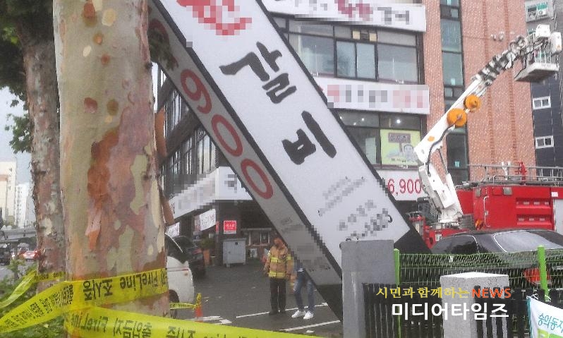 | 강풍에 파손된 간판 신속한 안전조치 모습. <ⓒ미디어타임즈> |