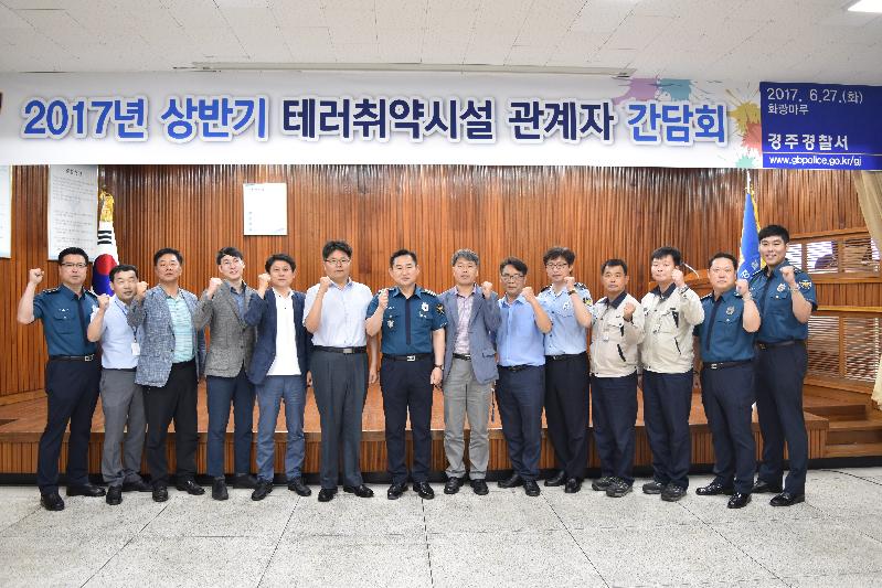 경주경찰서(서장 양우철)는 2017. 6. 27(화) 경주경찰서 대회의실에서 테러취약시설 관계자들과 간담회를 개최하였다. 이날 간담회에는 ㈜풍산 안강사업장, 한수원본사, 월성원자력본부, 경주교도소, 국립경주박물관, 신경주역, 대명리조트, 경주화백컨벤션센터 등 테러취약시설 관계자들이 참석한 가운데, 개최되었으며, 양우철 경주경찰서장은 “경주시민과 경주를 방문하는 관광객들의 안전을 확보하기 위해, 자체 안전대책 수립, 시설 개선 등 대테러 안전 활동에 힘써 줄 것”을 당부하였다. 참석자들은 “경찰서와 테러취약시설간의 유기적인 협력체제를