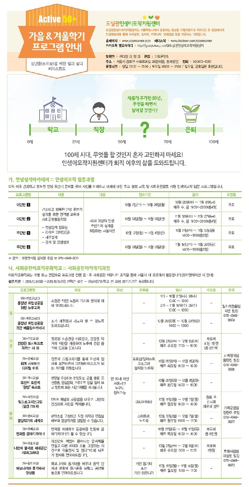 - 인생설계아카데미, 사회공헌이모작문화학교로 구성되며 총 12개 과정 진행