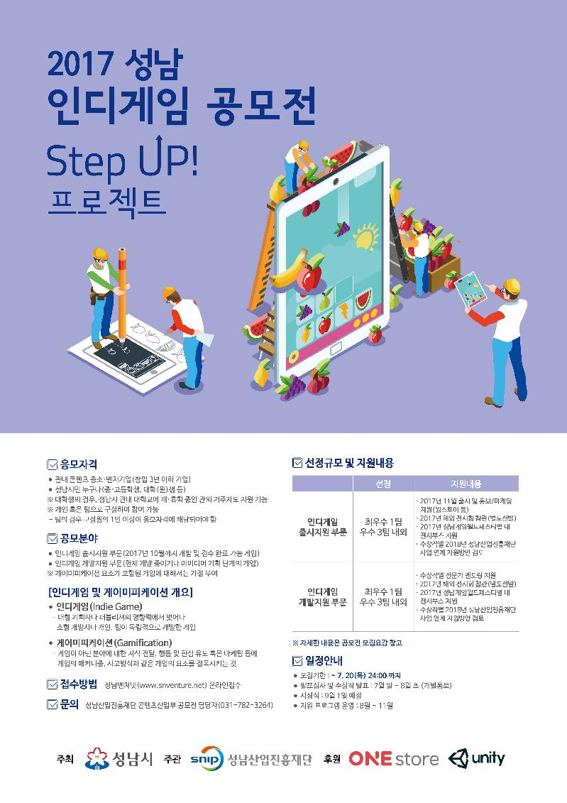 성남 차세대융합콘텐츠 캠퍼스 개소에 맞춰 추진하는‘2017 성남 인디게임 공모전 – Step up! 프로젝트’는 인디게임 개발자들이 겪는 개발, 출시, 홍보의 어려움에서 한 발 나아갈 수 있도록 지원하며, 성남시와 성남산업진흥재단이 주최, 주관하고 원스토어(주)와 유니티 테크놀로지스 코리아가 홍보·마케팅 등을 후원한다.