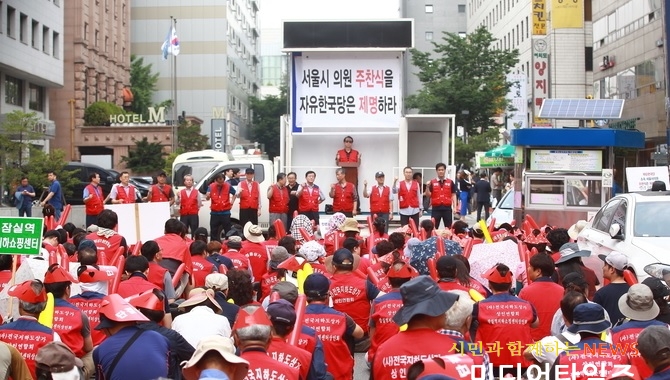 | (사)전국지하도상가 상인연합회 상인들이 28일 서울 여의도 자유한국당사 앞에서 서울시 지하도상가관리조례 개정(안) 결사반대 궐기대회를 열고 자유한국당 주찬식 서울시의원을 규탄하고 있다. |