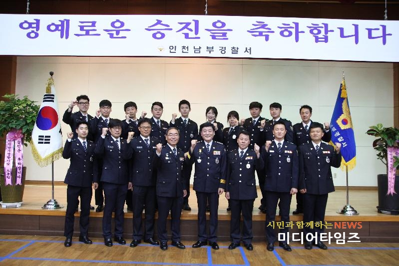 [미디어타임즈=문상수 기자] 인천남부경찰서(서장 조종림)는 2017년 6월 30일 오전10시 경찰서 4층 대강당에서 경찰서장, 동료직원 등 100여명이 참석한 가운데 승진자에 대한 승진임용식을 개최했다.승진자는 총 17명으로 경위 하효철 등 3명 경감으로, 경사 안도희 등 3명이 경위로, 경장 이종현 등 2명이 경사로, 순경 이환영 등 9명이 경장으로 한계급씩 승진의 영예를 얻었다.승진임용식 꽃인 계급장 부착식에서는, 동료직원들이 직접 달아주는 시간을 가졌으며 끝으로, 꽃다발 전달과 기념촬영으로 영광의 순간을 마무리했다.이날, 승진한 하효철 경감는“동료직원들이 있었기에 이런 승진의 기회도 생긴 것 같다”며“항상 감사한 마음과, 책임감 있는 경찰이 될 수 있도록 노력하겠다”고 말했다.한편, 조종림 남부서장은 “ 승진한 분들에게 다시한번 영예로운 승진을 축하하며” “승진 한 것은 그에 따른 책임과 의무가 커진 것이므로 항상 정성을 다하고 믿음직한 경찰이 될 수 있도록 최선을 다해 줄 것”을 당부했다.
