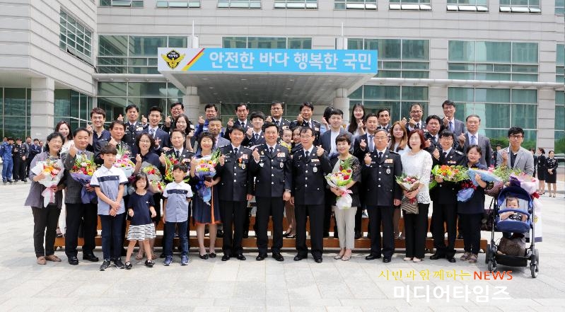 | 중부해경본부에서 17년 상반기 퇴임식 행사후 퇴직자 및 주요간부, 가족들이 기념촬영을 하고있다. <ⓒ미디어타임즈> |