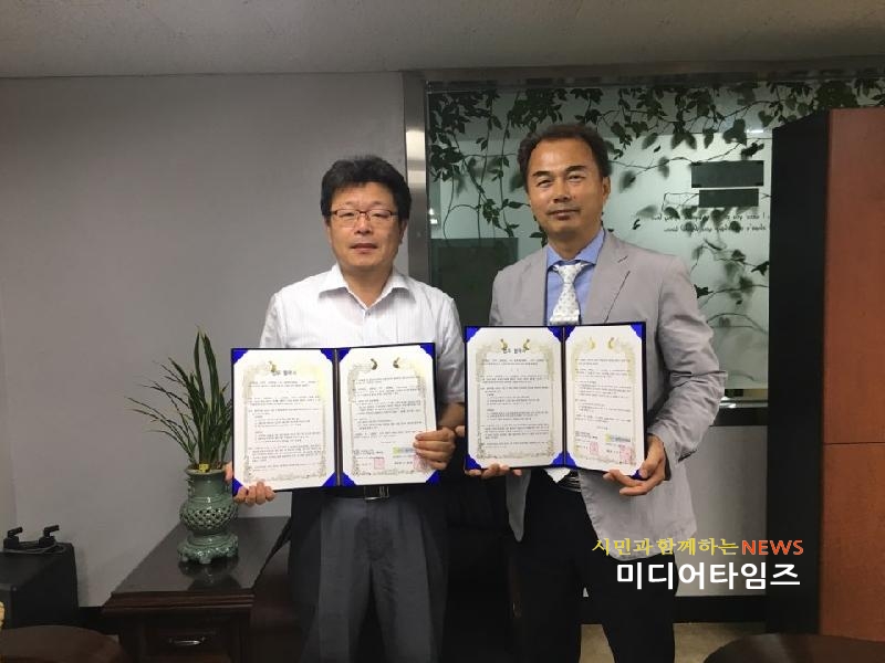 | 업무협약 모습.왼쪽-늘푸른요양병원 이창후 병원장, 오른쪽-은혜의집 김명동 부원장 <ⓒ미디어타임즈> |