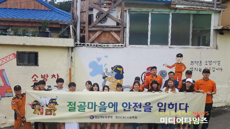 [미디어타임즈=홍기연 기자]인천서부소방서(서장 김준태)는 지난 7월 1일(토)에 서구 석남동 절골마을에서 소방차 길 터주기와 주택용소방시설인 소화기, 단독경보형감지기 설치 촉진을 위한 소방시설 벽화 그리기를 진행했다.이번 행사는 인천서부소방서 소방홍보팀과 서구 청라국제도시에 위치한 C&C 미술학원 강사 및 학생 30여 명이 참여, 절골마을 주택 벽에 소방안전문화 정착을 위해 주민에게 친근하게 다가갈 수 있는 “소방안전컬팬시 캐릭터”를 그려 마을주민과 등산로를 찾아온 관광객에게 소방안전의 중요성을 알리기 위해 마련됐다.주택용소방시설은 2011년 8월 4일 자로 소방시설설치 유지 및 안전관리에 관한 법률이 개정돼 2012년 2월 5일부터 신규주택은 의무적으로 소화기ㆍ단독경보형감지기를 설치하고 있다. 기존 주택도 마을 공동구매 등으로 자발적으로 설치에 동참 중에 있다.소방서 관계자는 “친숙하고 부드러운 캐릭터의 이미지로 벽화를 연출하였고 시민들이 재밌게 즐기며 소방에 대해 한번 생각하는 안전문화 정착에 기여하였으면 좋겠다며, 앞으로도 지속적으로 시민에게 관심을 끌 수 있는 다양한 시책을 추진하도록 노력하겠다”고 전했다.