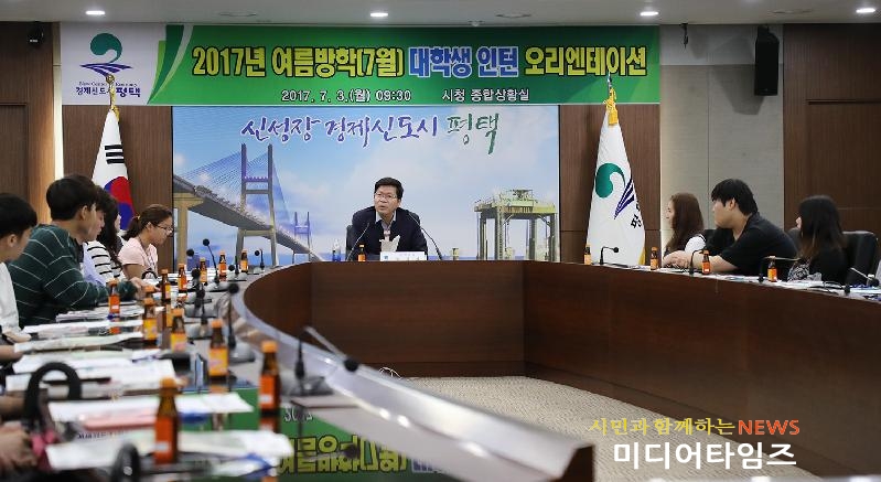 ○ 평택시(시장 공재광)는 지난 3일 오전 시청 종합상황실에서 시청 및 출장소, 읍·면·동주민센터 등 43개 부서에서 근무하게 될 대학생인턴 80명이 참석한 가운데 여름방학(7월) 대학생 인턴 오리엔테이션을 개최하고 본격적인 운영에 들어갔다.