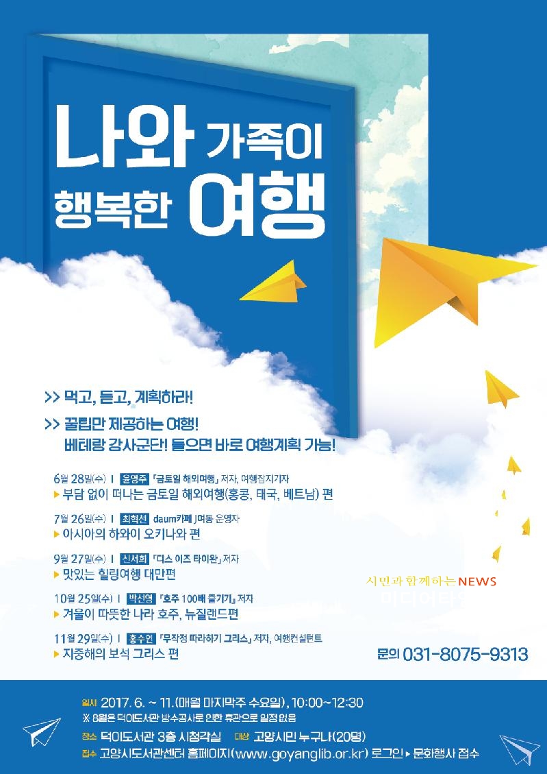 [미디어타임즈= 이영희 기자] 고양시(시장 최성) 덕이도서관은 오는 11월까지 매월 마지막 주 수요일 자유여행자를 위한 각종 정보 제공 및 홍콩, 일본, 호주, 그리스 등의 여행지를 소개하는 여행 강좌를 운영한다. 이는 ‘나와 가족이 행복한 여행’이라는 주제 아래 여행 초보자들을 위한 강의로 강의 후 바로 계획이 가능하도록 생생한 정보를 제공하고자 한다.