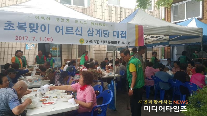 [미디어타임즈=홍기연 기자]인천 서구 가좌3동 새마을협의회(회장 이재석)와 새마을부녀회(회장 김옥화)는 지난 1일 초복을 맞이하여 관내 어르신 200여명을 모시고 가좌3동 경로당 앞마당에서 삼계탕 대접 행사를 가졌다.