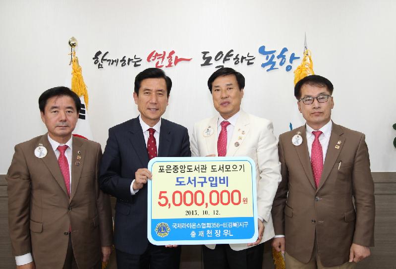 국제라이온스협회 356-E(경북) 지구(총재 천장우)가 임시운영에 들어간 포은중앙도서관에 도서구입비를 기부했다. 356-E(경북)지구는 12일 포항시청을 방문해 새로 개관하는 포은중앙도서관이 시민들의 소통과 휴식의 공간이 되는데 보탬이 되고자 도서구입비 5백만원을 전달했다. 이강덕 포항시장은 “지역 단체들의 끊임없는 후원이 생활밀착형 도서관의 활성화와 시민들이 책을 가까이 하는 계기가 될 것”이라며 감사의 뜻을 전했다. 천장우 총재는 “경북 최대의 도서관인 포은중앙도서관 장서확보에 작게나마 힘을 보탤 수 있어서 뿌듯함을 느낀다”며 “앞으로도 지역사회에 기여할 수 있는 협회가 될 수 있도록 노력하겠다”고 말했다. 한편 국제라이온스협회 356-E(경북)지구는 ‘봉사로 함께하는 세상’이라는 구호로 10개 지역 105개 클럽의 5,300여명의 회원들이 교육, 환경, 국제사회 등 다양한 분야에서 봉사활동을 펼치고 있다.// 심후보 기자