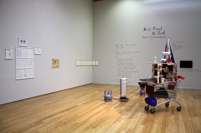또한, 한국 현대조각의 발전에 중추적인 역할을 한 작가 중 한 명인 최만린(1935~)의 작품 ‘이브’도 소개된다. ‘이브’는 단순하면서도 격렬하게 표현된 작품으로 전후 한국 상황과 격동기를 체감하는 젊은 조각도가 느껴야 했던 예민한 감정들이 묻어 있다. 이들 외에도 엄태정(1938~)의 초기작, ‘태세(An Attitude, 1968)’를 비롯해 박석원(1942~) 등 원로 조각가의 작품과 정현, 민균홍, 유봉상 등 중견 작가들을 포함해 우리나라 스틸 조각의 수작들을 이번 전시를 통해 볼 수 있다. 2전시실에서 진행되는 ‘모두를 위한 식탁’ 전시는 단순히 미각의 만족을 위한 ‘음식’이 아닌 사회 문화적 맥락에서 음식이 의미하는 바에 주목하고 있다. 요즘 방송매체에서 요리 프로그램들이 대세인 가운데 이런 현상들의 이면에는 ‘미각’이라는 인간의 원초적 감각을 자극하며, 정작 사유해야 하는 현실의 면면을 외면하게 하는 측면도 있을 것이다. ‘모두를 위한 식탁’ 전시에 참여한 6명의 작가는 ‘음식’이나 ‘요리’라는 익숙한 주제로 사회제도와 관습 등을 둘러싼 대립과 갈등의 문제를 독특하고 재미있는 방식으로 풀어내는 작품들을 전시한다. 전시 개막일인 14일 수요일 오후 4시에는 이색적인 개막 퍼포먼스가 예정되어 있다. 2층 2전시실에서 ‘모두를 위한 식탁’에 참여한 유목연 작가는 본인의 작품과 관련한 것으로 어묵꼬지와 만두 등을 요리해 관람객에서 나눠주는 퍼포먼스를 진행한다. ‘Built in Steel’과 ‘모두를 위한 식탁’ 전시는 모두 내년 1월 3일까지 진행되며, 관람료는 무료이다. // 심후보 기자