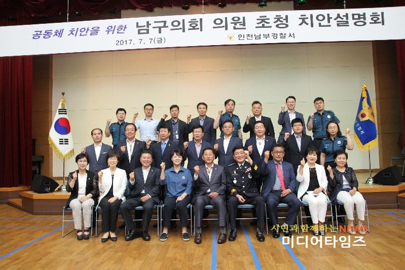 [미디어타임즈=문상수 기자] 인천남부경찰서(서장 조종림)는 7일 경찰서 4층 대강당에서 남구의회 이봉락 의장 등 의원 16명을 초청, 지역치안 발전을 위한 치안설명회를 개최했다.치안설명회는, 지역현안에 밝은 구의원들과 지역치안의 실무자인 경찰이 서로 치안 발전을 위해 현재의 문제점을 검토하고 필요 안건에 따른 해결방법을 찾고자 마련됐다.설명회는, 조종림 서장이‘보이스피싱범 검거’등 2017년도 남부경찰서에서 이뤄낸 주요성과 소개를 시작으로, 안전한 등·하굣길 조성, 안심마을 만들기 등 중점추진 업무에 대한 설명, 의원들과의 남구지역 치안방향에 대한 토의 순으로 진행됐다.끝으로, 제물포 담배골목 환경개선, 어린이 안전확보를 위한 시설개선, 안심마을 사업확대, 여성안심마을 조성 등 4가지 안건에 대해 토의하고 해결 방안을 모색하는 시간을 가졌다.이날, 설명회에 참석한 이봉락 의장은“한편, 조종림 서장은 “지역 치안에 관심을 갖고 참석해주신 16명의 의원분들께 다시 한번 감사드린다”며 “앞으로도 주민들에게 필요한 치안정책 등 필요 안건에 대해 적극 공유하고 협력하여 해결해 나갈 수 있도록 노력하겠다”고 말했다.