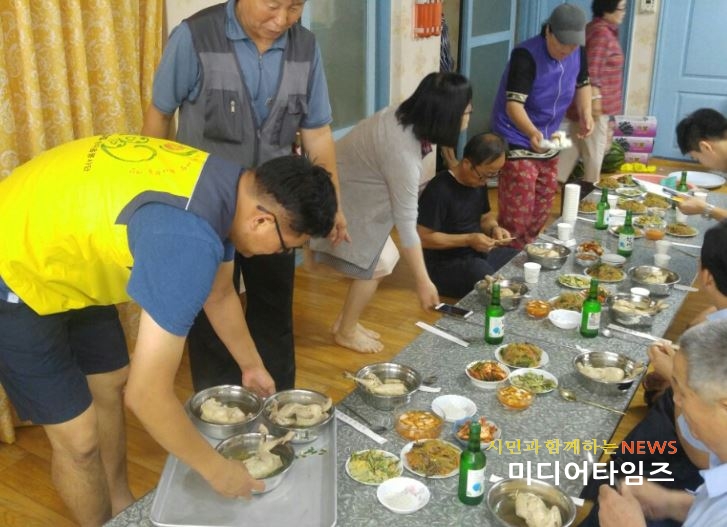 | 한전KPS(주) 한마음봉사단, 연희동 경로당 초복맞이 삼계탕 대접 봉사활동 모습.<ⓒ미디어타임즈> |