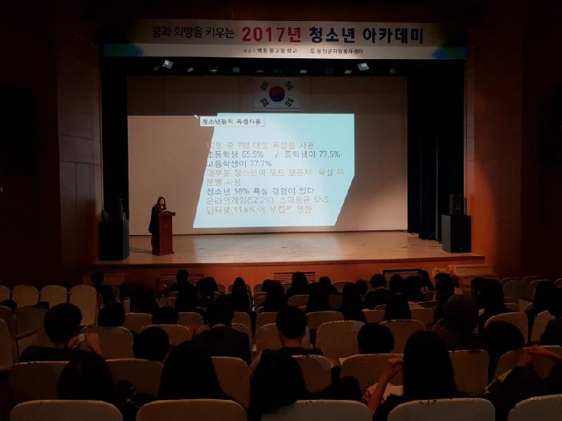 [미디어타임즈=문상수 기자] 인천옹진군자원봉사센터에서는 2017년 7월 13일(목) 옹진군 백령중고등학교 학생 170여명을 대상으로「욕설 없는 세상 만들기 언어예찬」이라는 주제로 청소년의 올바른 우리말 사용과 언어순화를 위한‘2017 청소년 아카데미’교육을 실시하였다.이번 교육은 여성가족부 언어예찬프로그램 전문강사로 활동중인 독서논술지도사 공미라 강사님을 초빙하여 최근 청소년들의 욕설 사용 실태와 동영상 자료를 통해“욕의 어원과 부정적인 기능”그리고“욕을 사용해서는 안되는 이유”에 대하여 학생들의 이해를 돕고 실천할 수 있도록 진행하였다.또한 본 교육을 통해 청소년들이 쉽게 사용하는 욕설이나 줄임말 등 잘못된 언어습관에 대한 인식의 개선과 학생들이 나 자신 외에 타인에 대한 배려심을 기르고, 나아가 자원봉사활동까지 연결하는 계기가 될 수 있도록 실시하였다.옹진군자원봉사센터에서는 앞으로 학생들이 보다 성숙한 사회인으로 성장할 수 있도록 다양한 프로그램의 소양교육을 꾸준히 진행할 계획이다.