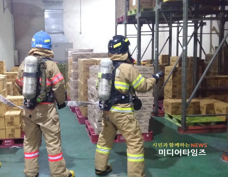 | 냉동창고 합동 소방훈련 모습. <미디어 타임즈> |