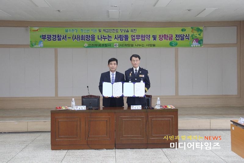 [미디어타임즈=문상수 기자] 인천부평경찰서 (서장 김봉운) 에서는, 지난 13일(목) 교육복지 후원기관인 사단법인 희망을 나누는 사람들(대표 김정안)과의 업무협약을 체결하고 부평서 관내아동복지센터 및 장애학교 등에서 추천받은 학생 10명에게 장학금 및 컴퓨터를 전달하였다.이번 부평경찰서와 (사)희망을 나누는 사람들과의 업무협약은 부평구 관내 청소년들을 대상으로 장학금 수여, 나눔교육, 문화예술체험, 희망진료 및 각종 생활필수품 등을 지원하고 청소년들에게 꿈과 희망을 심어 주어 우리사회의 올바른 인재로 성장할 수 있는 기회가 되었으면 하는 취지에서 협약을 추진하게 되었으며,본 협약식에 장학금을 받기 위해 참석한 한 학생의 보호자는 “경찰서에서 장학금을 받게 될 줄은 몰랐다. 정말 고맙고 우리 학생들에게 정말 큰 힘이 되었다” 며 감사의 말을 전했다.김봉운 부평경찰서장은 “앞으로도 경찰은 어려운 환경의 청소년들위해 지속적인 노력을 다할 것이고 이번 협약을 통하여 우리사회가 보다 안전하고 따뜻한 사회가 되기를 바란다. ”고 말했다.