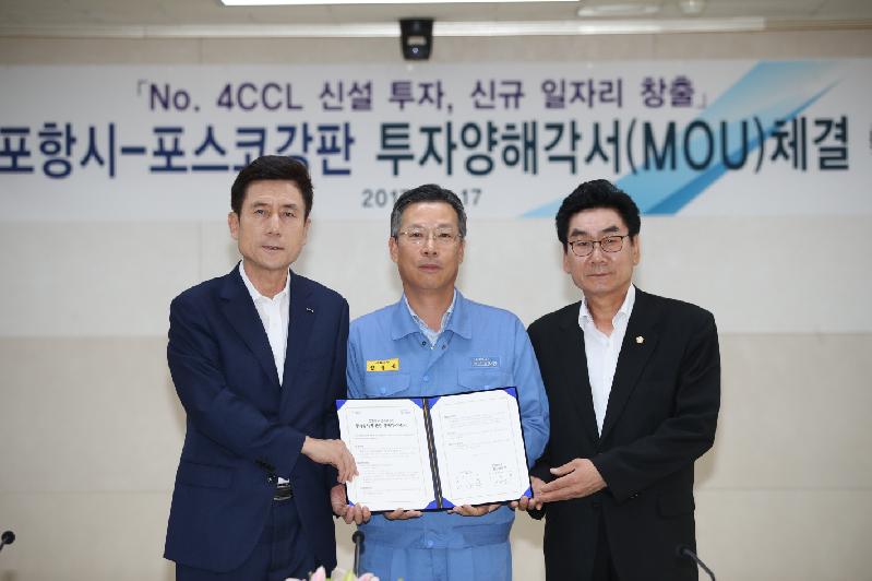 | 이강덕 포항시장, 전중선 포스코강판 대표, 문명호 포항시의회 의장이 투자양해각서를 들고 있다.<미디어 타임즈> |