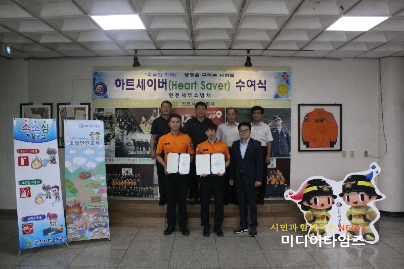 | 인천서부소방서, 하트세이버 2인에게 인증서 수여 모습.<ⓒ미디어타임즈> |