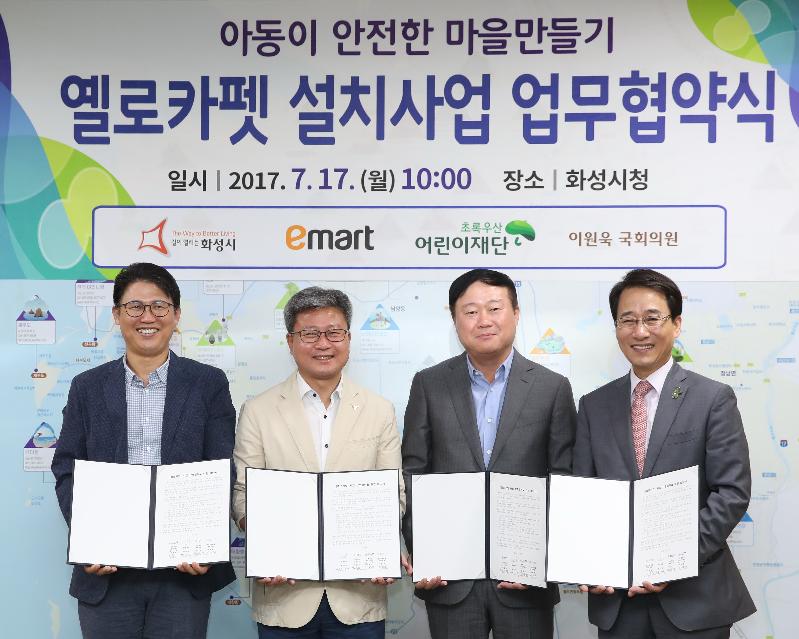 시는 17일 화성시청에서 이원욱 국회의원, ㈜이마트, 초록우산어린이재단과 ‘아동이 안전한 마을만들기’프로젝트의 일환인 옐로카펫 설치사업 업무협약을 체결했다.