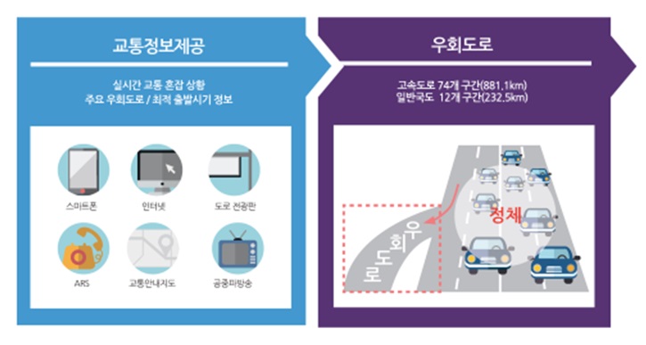 고속도로 23개 노선 74개 교통혼잡 예상 구간(888.1㎞)을 선정하여 관리한다. 일반국도 46호선 남양주~가평 등 교통혼잡이 예상되는 12개 구간(232.5㎞)에 대해는 우회도로가 지정·운영된다.