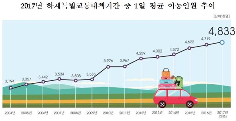 이번 대책기간 동안 올 여름휴가객의 약 60.6%가 몰릴 것으로 보인다. 특히 29부터 다음달 4일까지 7일간은 전체 중 38.3%의 이동수요가 집중돼 평시에 비해 약 47.2% 정도 이동인원이 증가할 것으로 예상된다.