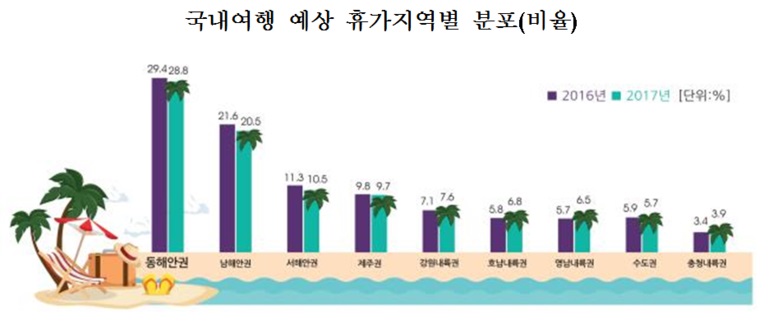 예상 휴가지역으로는 동해안권(28.8%)이 가장 높게 나타났으며 남해안권(20.5%), 서해안권(10.5%), 제주권(9.7%) 순으로 선호하는 것으로 나타났다.