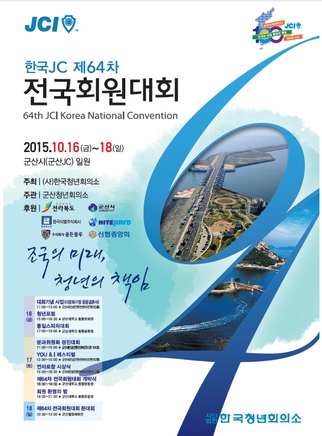 사단법인 한국청년회의소(이하 한국JC, 중앙회장 안영학)가 16일 오전11시부터 18일 일요일 오후까지, 군산새만금컨벤션센터를 비롯한 군산시 일원에서 ‘제64차 전국회원대회’를 개최한다.