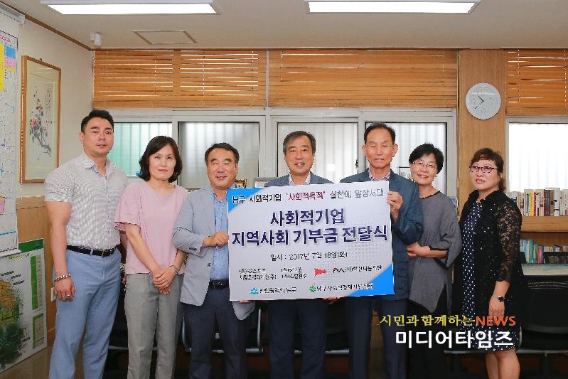 [미디어타임즈=문상수 기자] 인천 남구지역 사회적기업들이 공공의 이익을 위한 사회적 목적 실현에 앞장서고 있다.㈜세림조경디자인, ㈜에스에스스포츠, ㈜정다운, ㈜초림환경 등 남구 사회적기업 4곳은 18일 학산나눔재단에 각 100만원씩 총 400만원을 기부했다.이들 기업은 열악한 사회적 경제 환경에서도 2년 연속 이윤을 발생, 취약계층에게 일자리를 제공하는 등 모범적인 사회적기업의 모습을 보여주고 있다.전달식에 참여한 사회적기업 대표들은 이번 기부금이 공동체 활성화를 위한 지역 복지, 환경 등 여러 현안 해결에 도움이 됐으면 한다는 바람을 전했다.한편 사회적기업은 영리성과 공공성을 동시에 추구하지만 사회적 목적 달성을 위해 공공성에 더 중점을 두고 운영되고 있다.이에 따라 기업의 배분 가능한 이윤의 일부를 사회적 목적 실현을 위해 재투자하도록 관련법으로 규정하고 있다.