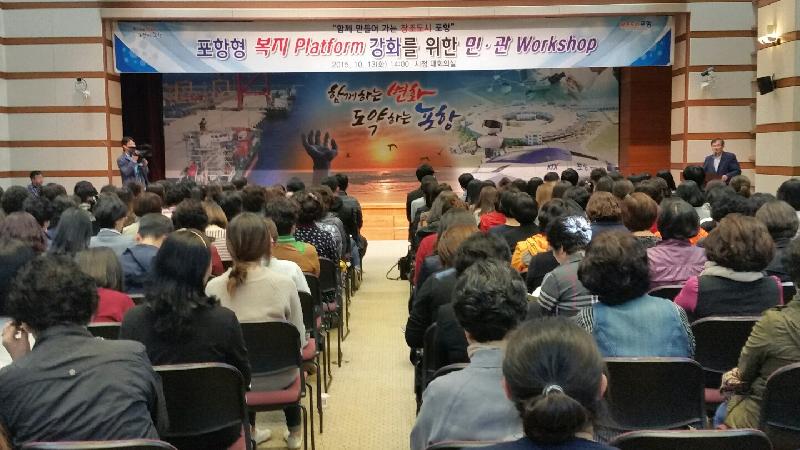 포항시는 13일 시청 대회의실에서 ‘포항형 복지 Platform 강화’를 위한 워크숍을 개최했다. 이날 워크숍에는 이점식 복지환경국장과 사회복지시설 종사자, 통합사례관리사, 의료급여사례관리사, 독거노인생활관리사, 아동통합서비스전문요원, 정신보건요원, 방문간호사와 시청, 구청, 읍면동 공무원 등 200여명이 참석했다. 워크숍은 부서 간 칸막이 제거와 민‧관협력을 통해 복지 중복서비스를 차단하고 누락서비스를 사전 예방하는 지역단위 통합 서비스제공 체계를 강화를 위해 개최됐으며, 복지환경국 주민복지과 주관으로 창조경제국, 남‧북구보건소, 평생학습원 등에서 26건의 협업과제를 선정 발표했다. 또한, 각 부서에서 추진하고 있는 통합사례관리사업, 다문화가족지원사업, 아동통합서비스지원사업, 출산힐링센터 운영 등 협업을 통해 저소득층, 노인, 장애인, 여성, 다문화, 출산 등 다양한 현장복지에 대한 사례와 정보를 공유했다. 이점식 복지환경국장은 “시민의 복지체감도 향상은 부서 간 소통과 협업은 물론 민‧관 협력을 통해 복지사각지대를 해소하는 것“이라며, “시민 체감형 복지 협업과제 발굴을 위해 지속적으로 지속적으로 노력 해줄 것“을 당부했다. // 심후보 기자