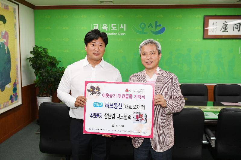 허브통신은 2011년에 휴대폰 판매 회사로 창립하여 2015~2016년에 유아용 장난감을 수입 및 유통하였으며 현재는 휴대폰 액세서리를 수입 및 유통하고 있는 관내 기업으로 장난감이 부족한 저소득 가정 및 시설의 아이들을 위해 나노블럭을 관내 아동복지시설에 기탁한 것이다.