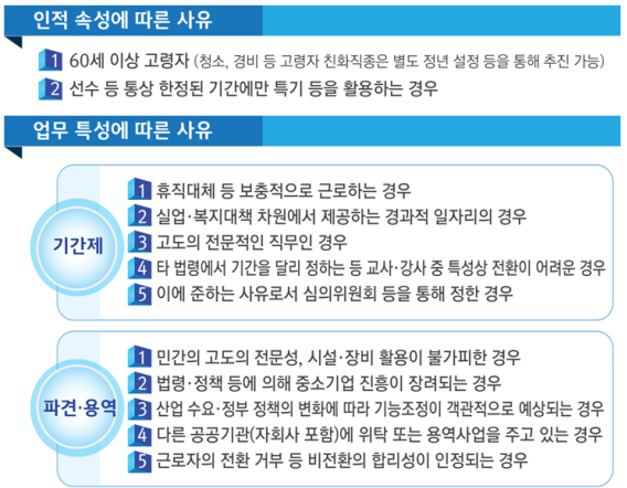 60세 이상 고령자나 운동선수 등 특기를 활용하는 경우도 원칙적으로는 정규직 전환 대상이 아니다. 그러나 청소, 경비 등 주로 고령자들이 종사하는 직종의 경우 필요에 따라 정년 설정 등을 통해 정규직 전환이 가능하도록 했다.