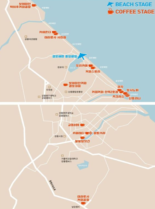 강릉 재즈프레소 페스티벌 커피 스테이지(Coffee Stage)는 경포·강문해변→안목해변→사천해변→시내 및 그 외 지역 등으로 이어진다.