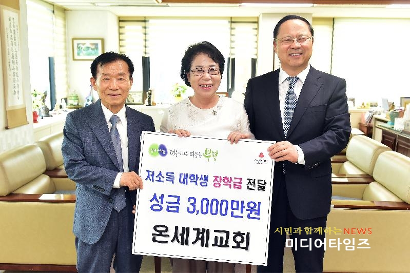 [미디어타임즈=문상수 기자] 온세계교회 김용택 담임목사와 박병관 장로는 20일 오후 홍미영 부평구청장실을 방문, 저소득 가구의 대학생을 위한 장학금 3천만 원을 기부하는 전달식을 가졌다.온세계교회는 2016년에도 대학생 장학금 지원(3천만 원), 사회취약계층 인플루엔자(독감) 무료접종(525만 원 상당), 사랑의 쌀 나눔(825만여 원) 등 부평구 지역 주민들을 위한 다양한 사회공헌 활동을 해오고 있다.홍미영 부평구청장은 “지역 사회를 위해 매년 꾸준하게 기부해주는 교회에 감사드리며, 어려운 대학생들에게 잘 전달하도록 최선을 다하겠다”고 강조했다.전국의 대학생 학자금 대출자가 135만 여명에 이를 정도로 빚을 안고 사회에 첫 발을 딛는 젊은이들이 상당수인 현실에서, 이번 장학금 기부가 저소득 층 학생들이 등록금 걱정에서 벗어나 학업에 정진할 수 있는 기회가 될 것으로 기대된다.